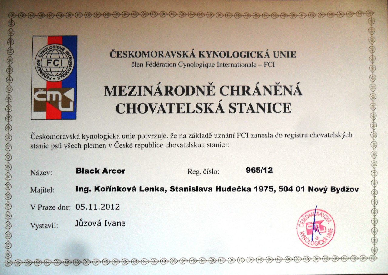 Přišla dobrá zpráva z ČMKU. Hned první název nám FCI v Belgii schválili a naše chovatelská stanice ponese název Black Arcor - ze spojení dvou jmen - Arcose (Arcos Rebel Alve) a Cory (Chimera Carboneum). Na památku nejlepšího pejska, kterého jsem kdy měla ARCOSE a na památku zakladatelky našeho chovu CORY. Štěňátka plánujeme na příští rok.