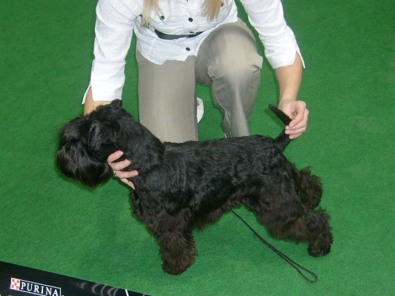 V naší třídě se sešli celkem čtyři pejskové z ČR včetně našeho vousáčka. Na stole se Arčíno nechal v klidu prohlédnou. I kohoutkovou výšku a zoubky zvládnul, což mi udělalo velkou radost. Horší bylo předvedení v pohybu.. Píďa zastal názoru, že výstava přece není žádný maraton a po jednom uběhnutém kolečku odmítl udělat další krok a sedl si. Zatímco ostatní dobíhali druhé kolo, my jim fandili "v cíli". Rozhodčí paní Vodrážková říkala, že Arčík je krásné štěndo a doplatili jsme na jeho věk. Ostatní vousáčci měli kolem 12M, Arčíkovi je 9M. Nepřidalo nám ani nahnědlé zbarvení srsti, což je výsledek NEbarvení a NEkřídování. Roboran tablety a šampón na černou srst bohužel nestačí. Uvidíme, zda z něj uděláme takového krasavce jako je Gudík, Griffin nebo vítěz Chico. Odnesli jsme si známkou VÝBRONOU 4.